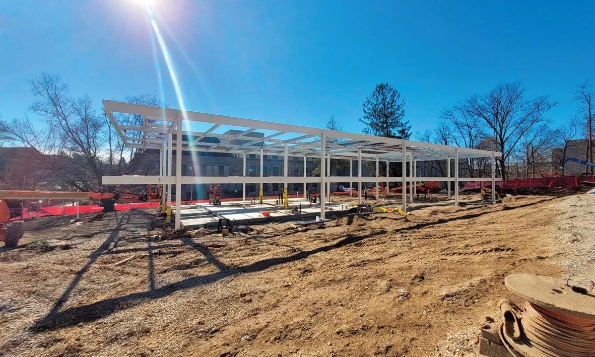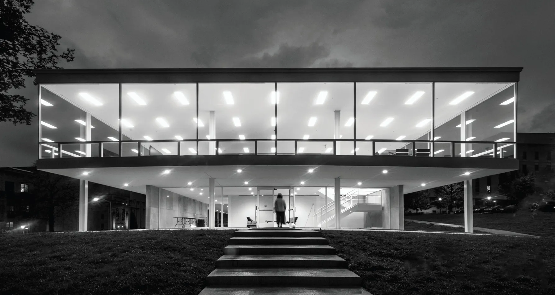 The two-story, nearly 10,000-sq.-ft building, which officially opened in April 2022, features a lecture hall, offices, and meeting rooms for faculty and staff. The ground floor is mostly open, while a central square atrium carves the upper level. The design brings abundant light to the interiors with a white-painted steel frame and floor-to-ceiling windows. The original design was followed with only minimal alterations to the visible architecture. Changes to the ground level included the reconfiguration of the stairs to comply with current safety codes, in addition to an expanded mechanical room, and other modifications included the addition of a hydraulic elevator and changing the glazing from a single pane to high-performance insulating glass. The second floor of the original design remained largely intact, repurposed from bedrooms to offices.