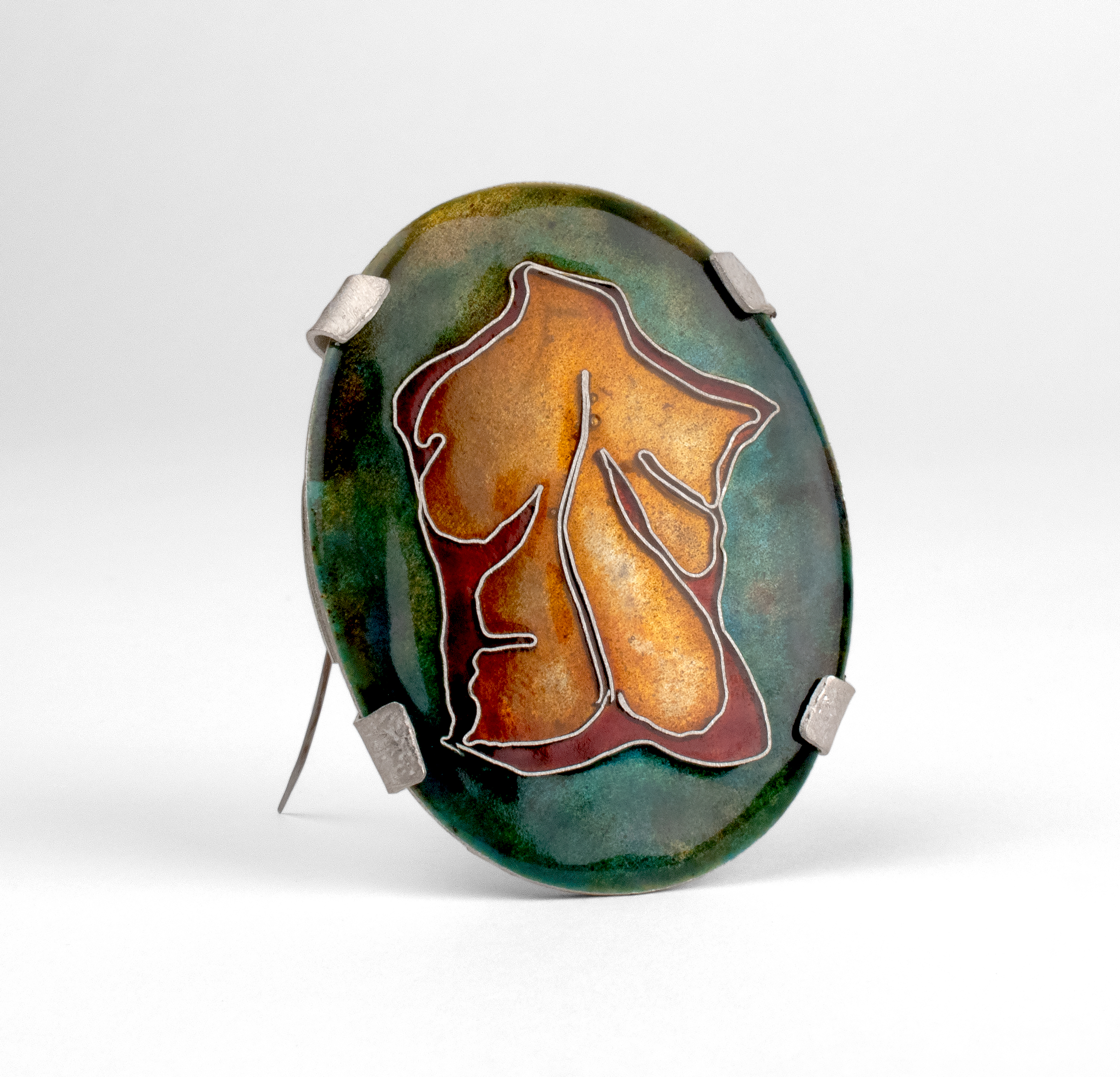 DS: Enameling is the process of fusing powdered glass on a metal like copper or silver. The cloisonné technique includes creating shapes with fine silver wire, then fusing down the wires and enamel. I use cloisonné to create illustrative narratives. The entire process is methodical and careful, as the enamel glass can crack if it's handled improperly.