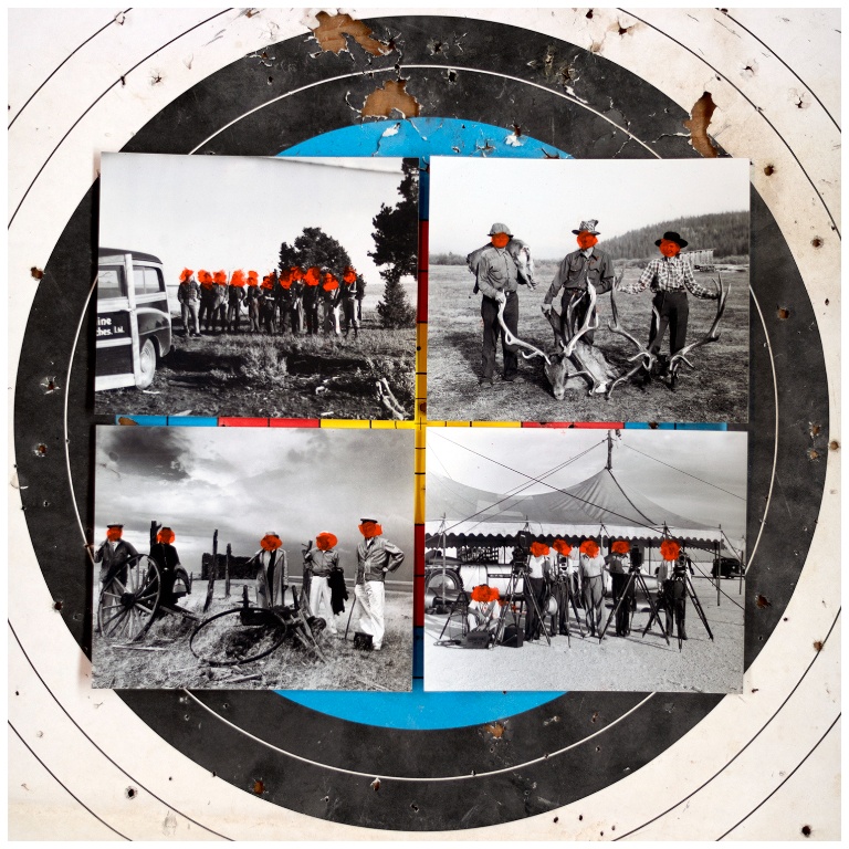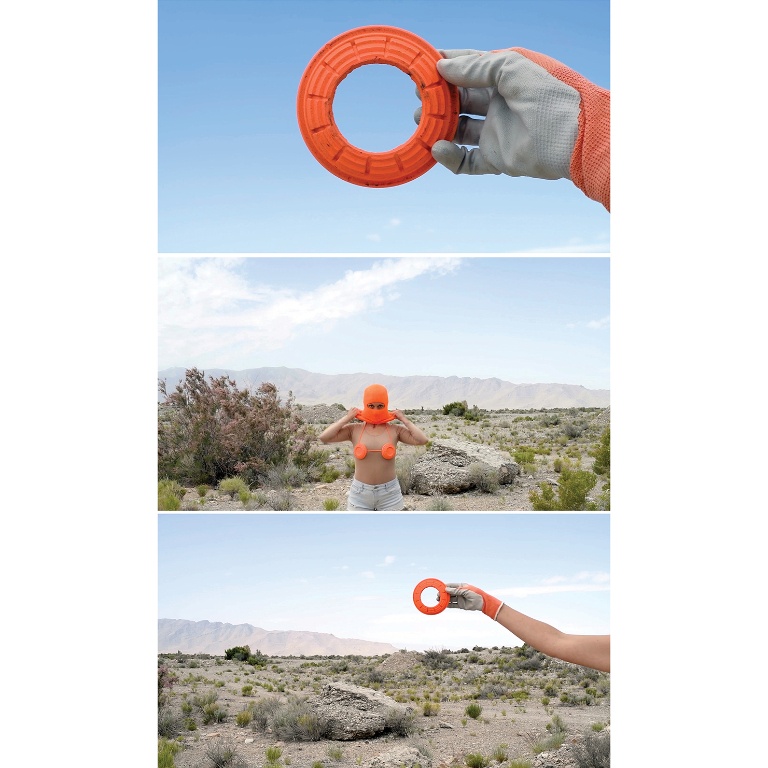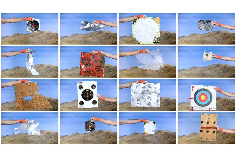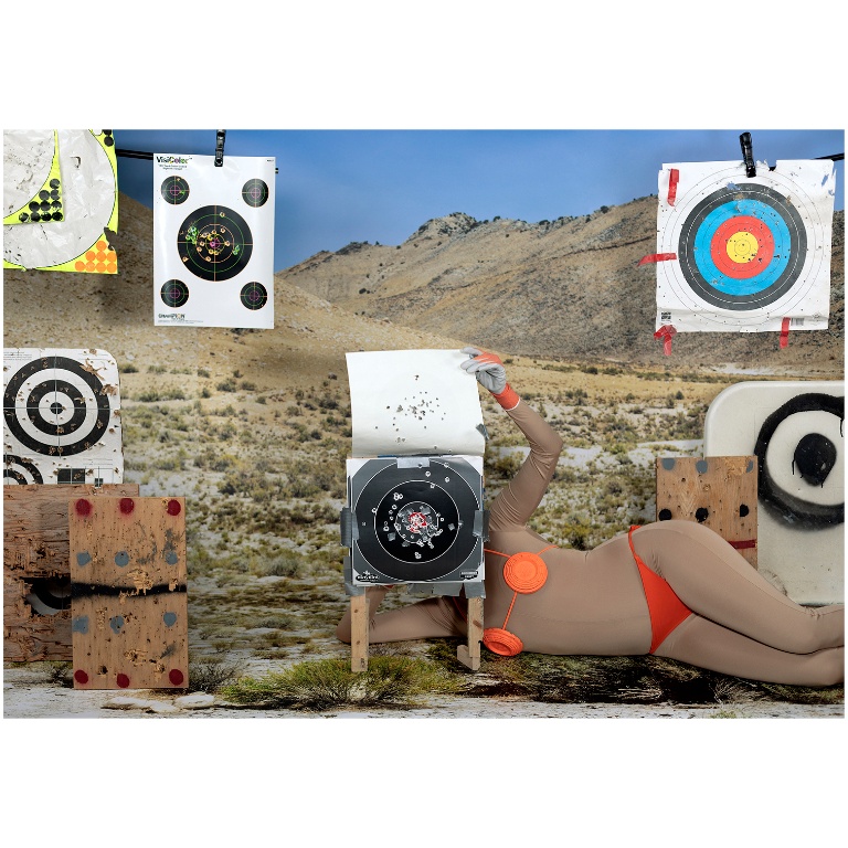 The fraught patriarchal and photographic relationships between the land and the body that Wright examined in Marked carry through in High Visibility. In a darkly humorous take, an odalisque in a blaze orange bikini casually flips targets in front of her head. With a nod to Martha Rosler’s Semiotics of the Kitchen, Wright presents desecrated objects to the camera, holding each up like an indictment. High Visibility, critically and with a touch of humor, urges us toward a reconsideration of our relationship with the land.