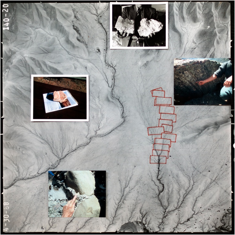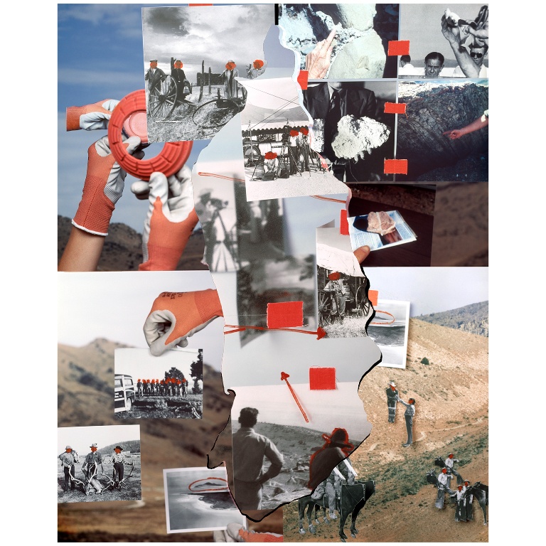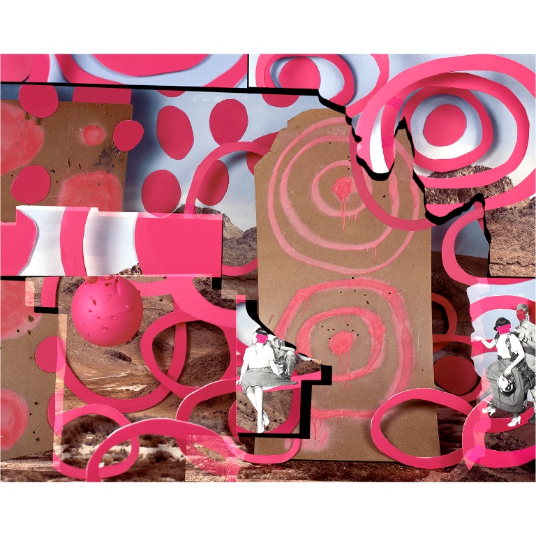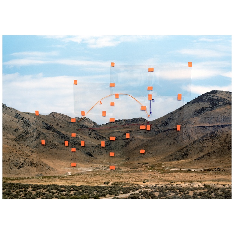 Disruption is everywhere in Jaclyn Wright’s assemblages. Blaze orange, the eyeball searing color meant to snap us to attention, blasts through Wright’s multi-dimensional observations on the disturbed landscape of western Utah, where she resides. Her marked-up collages feel like a sport playbook—arrows and grids expose hidden strategies on land long-considered a playing field. The shape of the shrinking Salt Lake recurs, the environmental price of Western progress. Wright’s work plays in the wreckage of exploitative histories—from ranching to weapons testing to the bullet riddled targets left in the disregarded desert.