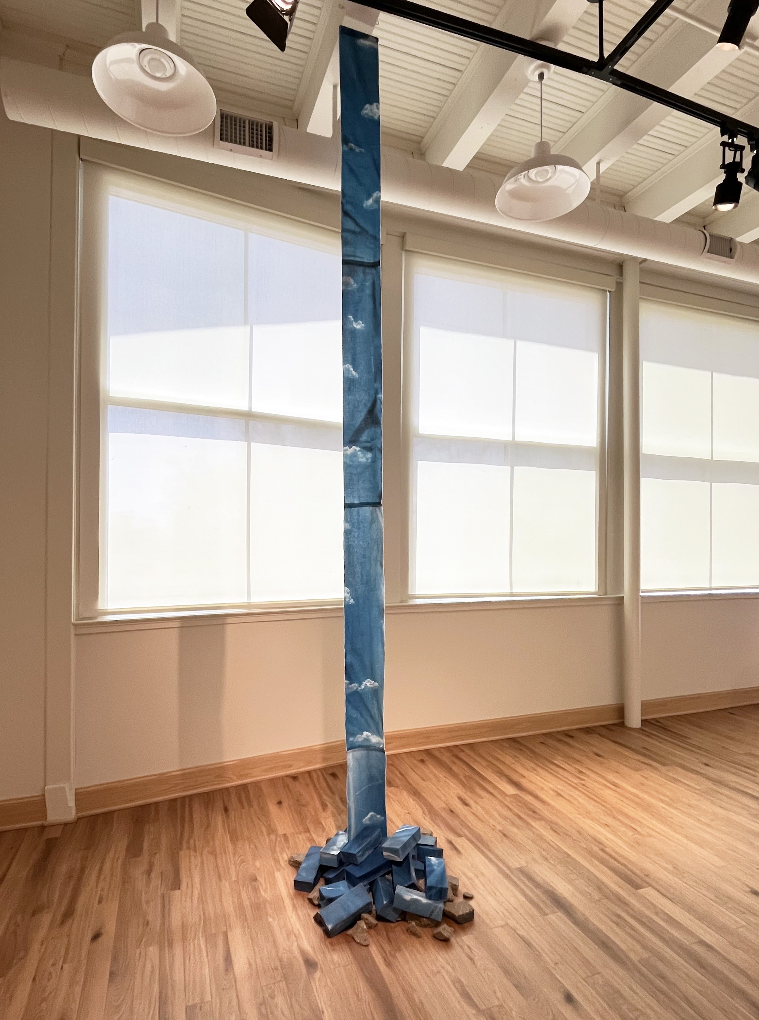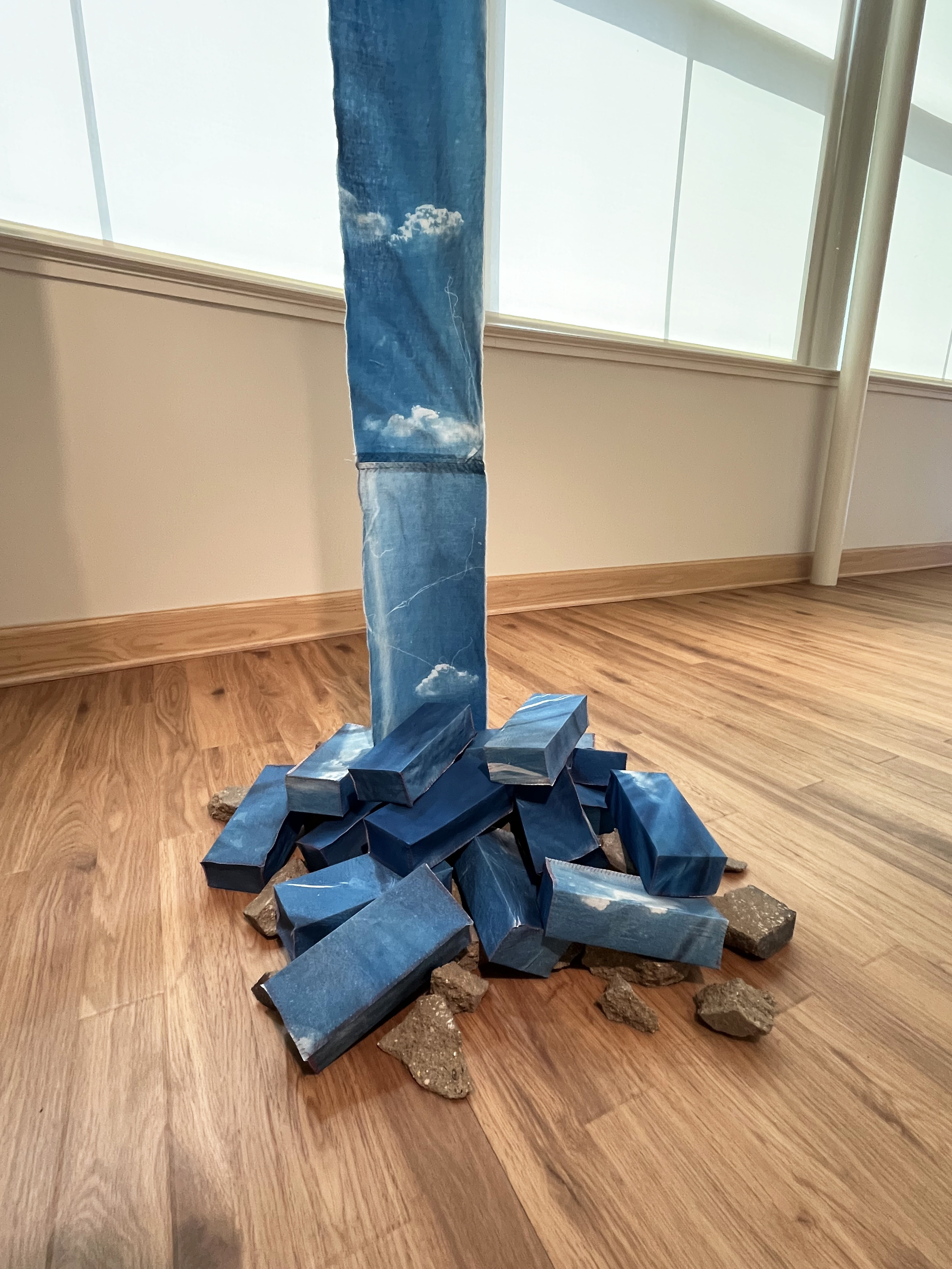 Her artwork "Skyfall" features soft, cyanotype-dyed bricks made of fabric, each resembling fragments of sky. Assembled into a suspended textile installation, the piece poetically evokes the collapse of the sky itself.