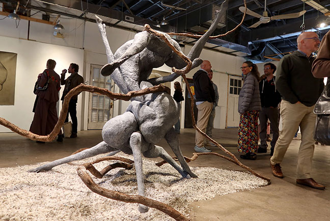 “I’m experimenting with new materials,” she says of the installation work that is central to the space. The piece,Use Your Words, is an abstraction morphing human anatomy with the legs and hooves of horses. Fabricated on an armature of steel and layered with foam, fiberglass, and resin, it stands 10 feet high and stretches 12 feet by 16 feet. A base of crushed salt and a three-dimensional drawing done with thick grapevines expand the piece to dominate the I Fell Gallery space.