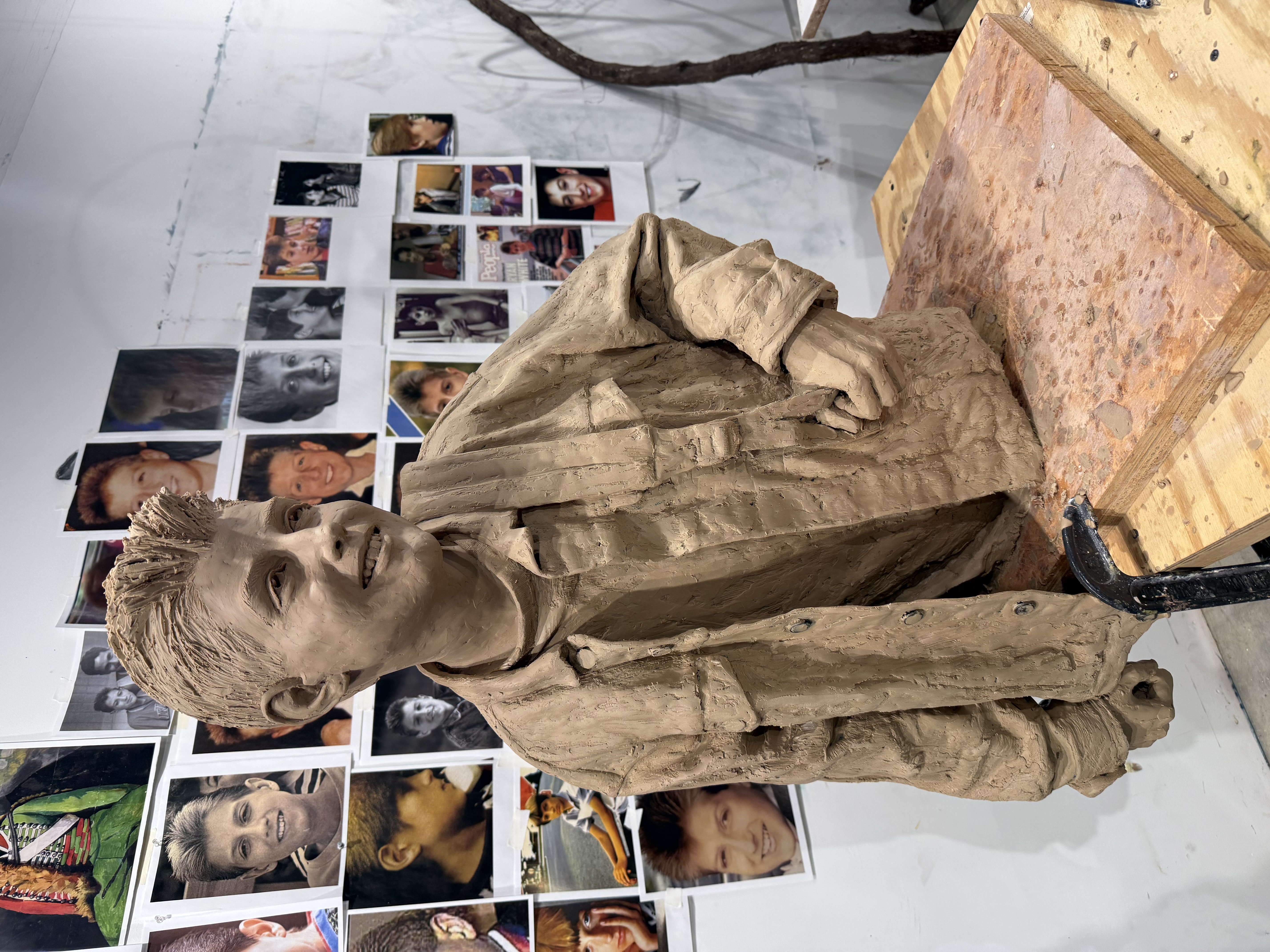 While White's legacy is larger than life, Pennington is simultaneously working to bring his humanness into the piece. Surrounded by dozens of photos of Ryan tacked to her studio wall, Pennington hopes to capture not only his likeness, but “the spirit that I’ve picked up researching him and watching his interviews,” she says. “There was a casual confidence that he had, a kindness, and an openness. I wanted to capture all of those things in the posture, in the movement, in his looking out at us while moving in another direction.”